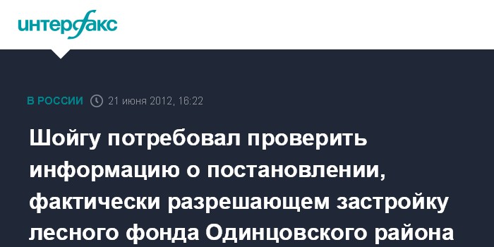 Санкт-Петербург. 21 июня. INTERFAX.RU - Губернатор Московской области Сергей Шойгу дал поручение разобраться с появившейся в СМИ информацией о переводе лесного фонда Одинцовского района в земли населенных пунктов.