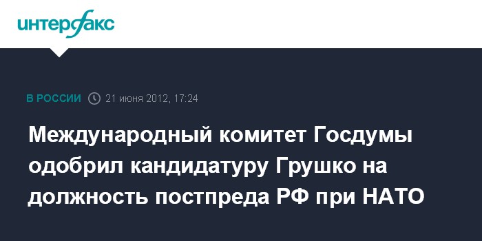Москва. 21 июня. INTERFAX.RU - Международный комитет Госдумы согласился с назначением замглавы МИД РФ Александра Грушко постоянным представителем РФ при НАТО.