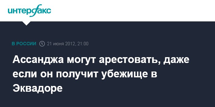 Лондон. 21 июня. INTERFAX.RU - Основатель WikiLeaks Джулиан Ассандж, скорее всего, будет арестован британской полицией, даже если власти Эквадора согласятся предоставить ему убежище, пишет в четверг британская газета The Daily Telegraph.