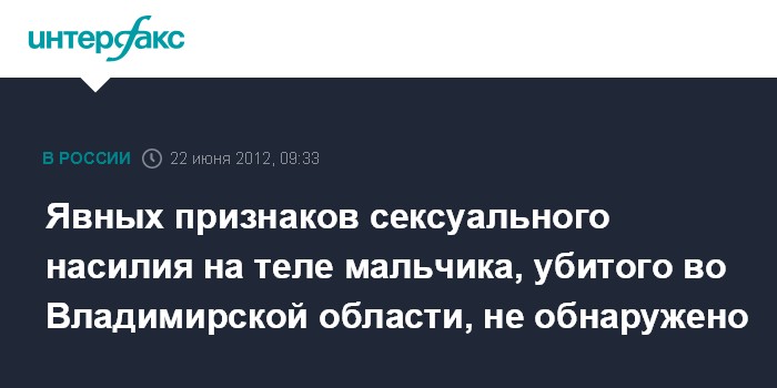Владимир. 22 июня. INTERFAX.RU - Явных признаков сексуального насилия на теле пятилетнего Богдана Прахова, убитого неизвестным во Владимирской области, не обнаружено, сообщила в пятницу "Интерфаксу" старший помощник руководителя СУ СК России по региону Ирина Минина.