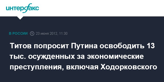 Москва. 23 июня. INTERFAX.RU - Глава "Деловой России" Борис Титов, назначенный на этой неделе федеральным омбудсменом по защите предпринимателей, обратится к президенту Владимиру Путину с просьбой об освобождении 13 тыс. заключенных, осужденных за экономические преступления. Под амнистию должен попасть и экс-глава "ЮКОСа" Михаил Ходорковский, срок заключения которого истекает в 2017 году, полагает Б.Титов. "Для инвестиционного климата это будет хорошая новость. Это было бы правильным и справедливым решением", - сказал омбудсмен в интервью агентству Bloomberg.