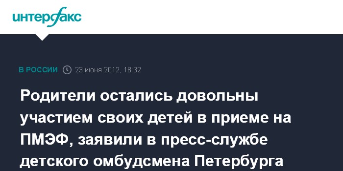 Москва. 23 июня. INTERFAX.RU - Дети и их родители, участвовавшие в представлении на Петербургском экономическом форуме, остались довольны и не жаловались на ущемление их прав, заявила пресс-служба уполномоченного по правам ребенка в Санкт-Петербурге.