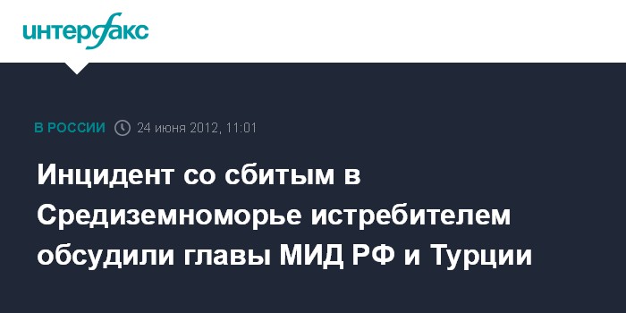 Москва. 24 июня. INTERFAX.RU - Министр иностранных дел России Сергей Лавров в телефонном разговоре с главой МИД Турецкой Республики Ахметом Давутоглу обсудил инцидент с турецким истребителем, сообщает в воскресенье сайт российского внешнеполитического ведомства. 23 июня по инициативе турецкой стороны состоялся телефонный разговор министра иностранных дел Российской Федерации С.Лаврова с министром иностранных дел Турецкой Республики А.Давутоглу. В ходе беседы была обсуждена ситуация вокруг Сирии, в том числе в контексте имевшего место инцидента с турецким истребителем", - говорится в сообщении.