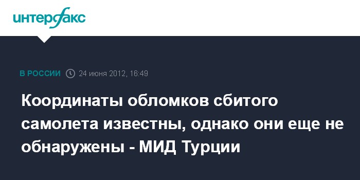Стамбул. 24 июня. INTERFAX.RU - Властям Турции известны координаты сбитого сирийским ПВО самолета, однако они еще не были обнаружены, заявил представитель МИД страны Сельчук Унал. Раннее некоторые турецкие СМИ сообщали, что поисково-спасательные команды обнаружили обломки сбитого военного самолета на глубине 1,3 тыс. метров. С.Унал сказал также, что властям неизвестно, сумели ли пилоты катапультироваться, и что их поиск является приоритетной задачей.