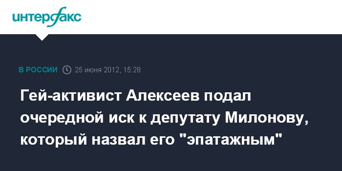 Также в понедеьлник Алексеев направил в Октябрьский районный суд Санкт-Петербурга третий иск о защите чести и достоинства к депутату Милонову, сообщает GayRussia.Ru. Поводом для обращения с новым иском в суд послужила характеристика Виталия Милонова, данная им Николаю Алексееву во время слушаний в Законодательном Собрании в минувшую пятницу 22 июня, посвященных практике применения нового петербургского закона об ответственности за пропаганду гомосексуализма среди несовершеннолетних. Тогда депутат назвал гей-активиста "эпатажным".