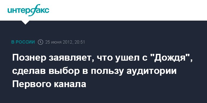 Москва. 25 июня. INTERFAX.RU - Известный телеведущий Владимир Познер заявил, что решающим фактором в его выборе между Первым каналом и телеканалом "Дождь" стал размер аудитории.