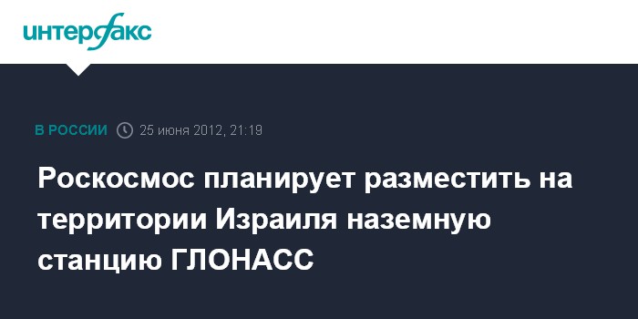 Иерусалим. 25 июня. INTERFAX.RU - Роскосмос планирует до конца 2012 года выйти с Израилем на соглашение о размещении на его территории наземной станции российской спутниковой системы навигации ГЛОНАСС, сообщил журналистам глава Роскосмоса Владимир Поповкин.