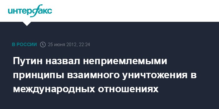 Иерусалим. 25 июня. INTERFAX.RU - Принципы взаимного уничтожения в международных отношениях неприемлемы, заявил президент России Владимир Путин на торжественном ужине, организованном в его честь президентом Израиля Шимоном Пересом.
