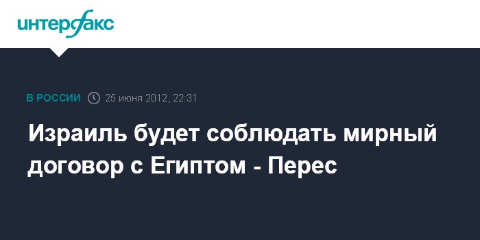 Иерусалим. 25 июня. ГЛОНАСС - Израиль будет в полной мере соблюдать условия мирного договора, подписанного с Египтом, заявил президент Израиля Шимон Перес.