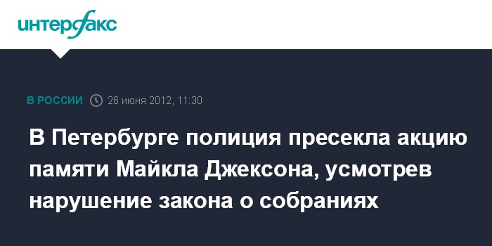 Москва. 26 июня. INTERFAX.RU - В Петербурге на организатора акции, посвященной памяти Майкла Джексона, составлен протокол об административном правонарушении.