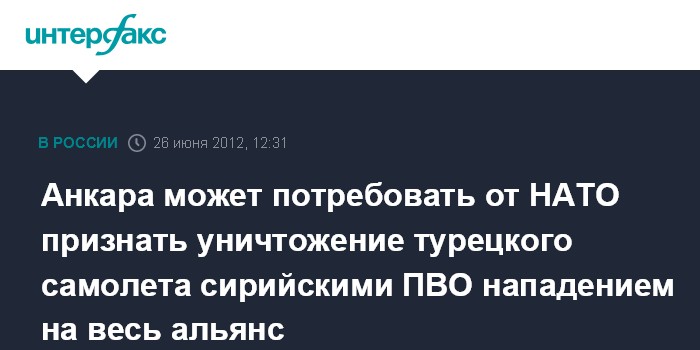 Вашингтон. 26 июня. INTERFAX.RU - Турция на встрече НАТО во вторник может обратиться с призывом о признании уничтожения турецкого истребителя сирийскими ПВО фактом нападения на весь альянс, сообщает Bloomberg со ссылкой на заместителя премьер-министра Турции Бюлента Арынча.