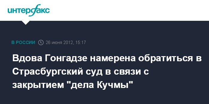 Киев. 26 июня. INTERFAX.RU - Вдова журналиста Георгия Гонгадзе Мирослава будет искать справедливости в Европейском суде по правам человека после вынесения решения о законности снятия обвинений со второго президента Украины Леонида Кучмы в причастности к убийству журналиста, заявила представитель ее интересов Валентина Теличенко.