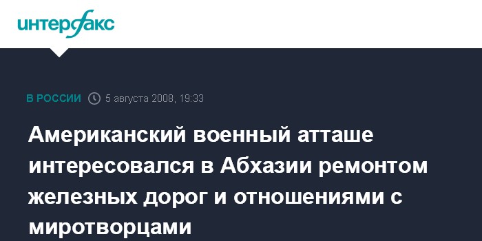 "Военный атташе посольства США в Грузии интересовался ремонтными работами на железнодорожном участке "Сухум-Очамчира", осуществленными железнодорожными войсками, а также взрывами, имевшими место в июне в Сухуми, Гагре и Гали", - сообщили "Интерфаксу" в пресс-службе военного ведомства непризнанной республики.