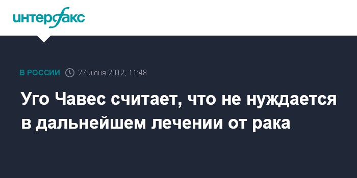Каракас. 27 июня. INTERFAX.RU - Президент Венесуэлы Уго Чавес заявил, что не видит необходимости в дальнейшем лечении от рака и что чувствует себя хорошо, сообщают в среду местные СМИ.