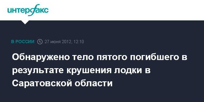 Саратов. 27 июня. INTERFAX.RU - Из реки Большой Иргиз в Пугачевском районе Саратовской области извлечено тело пятого погибшего в результате опрокидывания лодки 17 июня.