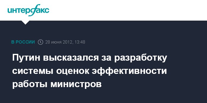 Москва. 28 июня. INTERFAX.RU - Президент РФ Владимир Путин потребовал разработать и внедрить систему оценки эффективности деятельности министров и руководителей федеральных ведомств.