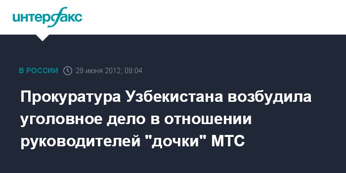 Ташкент. 29 июня. INTERFAX.RU - Генеральная прокуратура Узбекистана возбудила уголовное дело в отношении группы должностных лиц узбекской "дочки" ОАО "МТС" - ООО "Уздунробита", сообщила пресс-служба прокуратуры.