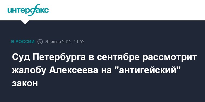Санкт-Петербург. 29 июня. INTERFAX.RU - Жалобу гей-активиста Николая Алексеева на петербургский закон о запрете пропаганды педофилии и гомосексуализма среди несовершеннолетних принял к рассмотрению Уставный суд северной столицы, сообщила пресс-служба правозащитного проекта GayRussia.ru.