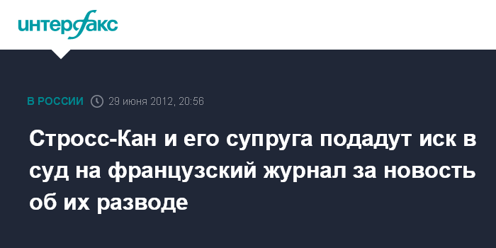 Париж. 29 июня. INTERFAX.RU - Бывший глава Международного валютного фонда (МВФ) Доминик Стросс-Кан и его жена Энн Синклер намерены обратиться с иском в суд против французского глянцевого журнала "Клосер", распространившего информацию об их разводе, сообщает в пятницу агентство AFP. Стросс-Кан и Синклер обвинили сотрудников журнала во вторжении в их личную жизнь.