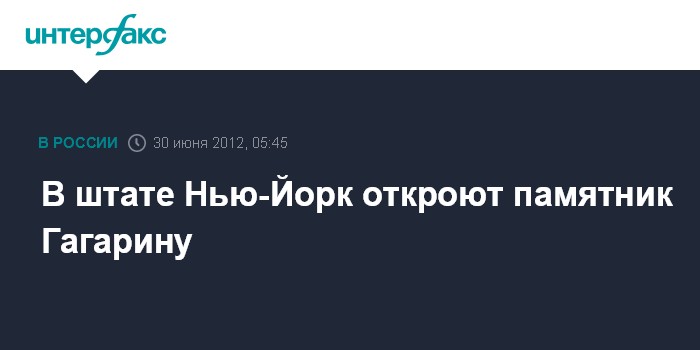 Вашингтон. 30 июня. ИНТЕРФАКС - Памятник первому в мире космонавту Юрию Гагарину будет торжественно открыт в субботу в музее "Колыбель авиации" в штате Нью-Йорк.