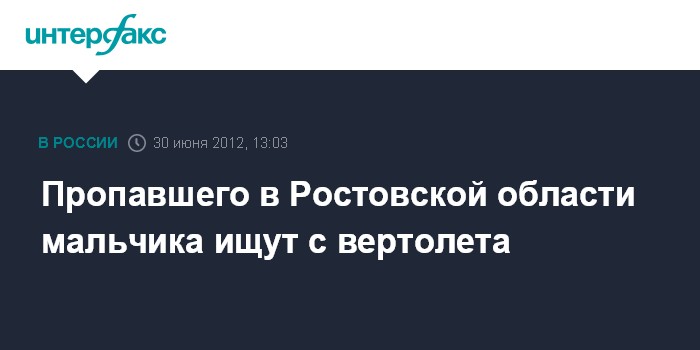 Ростов-на-Дону. 30 июня. INTERFAX.RU - Вертолет Ми-8 МЧС РФ направлен в Аксайский район Ростовской области для поиска пропавшего 11-летнего ребенка, страдающего аутизмом, сообщили агентству "Интерфакс-Юг" в пресс-службе Южного регионального центра МЧС России. "Вертолет Ми-8 МЧС России со спасателями на борту поднят для проведения поиска 11-летнего ребенка, который пропал в минувшую пятницу в Аксайском районе", - сказал представитель пресс-службы.