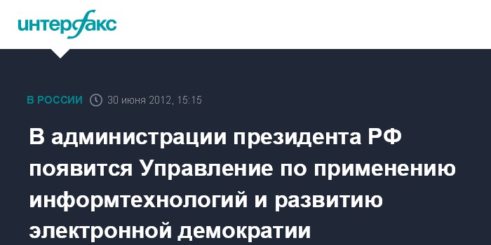 Москва. 30 июня. INTERFAX.RU - Президент России Владимир Путин подписал Указ "Об Управлении президента Российской Федерации по применению информационных технологий и развитию электронной демократии", сообщает пресс-служба Кремля. "В целях обеспечения деятельности президента РФ по развитию информационных технологий постановляю образовать в составе Администрации президента РФ Управление президента РФ по применению информационных технологий и развитию электронной демократии", - говорится в тексте документа.