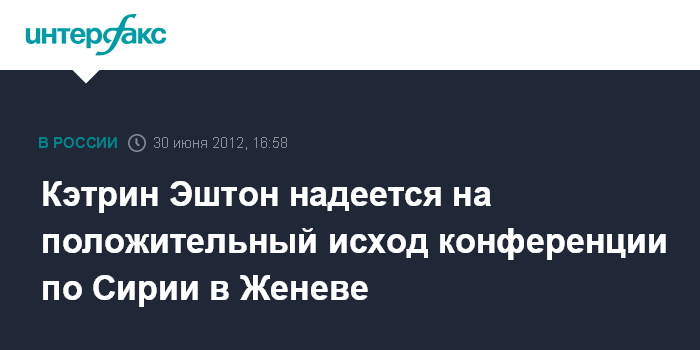 Женева. 30 июня. INTERFAX.RU - Верховный представитель ЕС по иностранным делам и политике безопасности Кэтрин Эштон выразила надежду на то, что субботняя международная конференция по Сирии пройдет успешно. Глава европейской дипломатии надеется, что "переговоры приведут к положительным результатам". Об этом она сказала журналистам по окончании первой двухчасовой сессии переговоров.