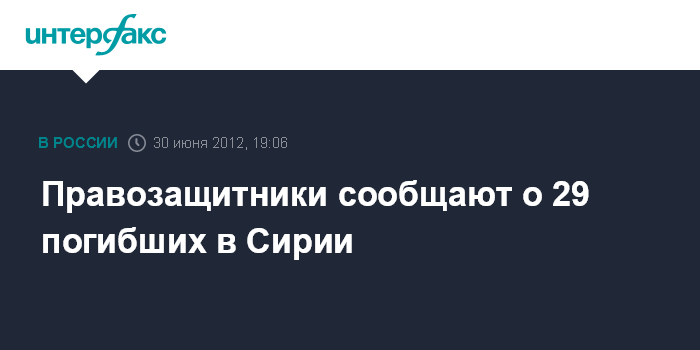 Лондон. 30 июня. INTERFAX.RU - Не менее 29 человек погибло в субботу в результате столкновений между сирийскими правительственными войсками и оппозицией, заявили сотрудники базирующегося в Лондоне Наблюдательного совета по правам человека в Сирии. По данным правозащитников, 23 человека из числа погибших были мирными жителями.