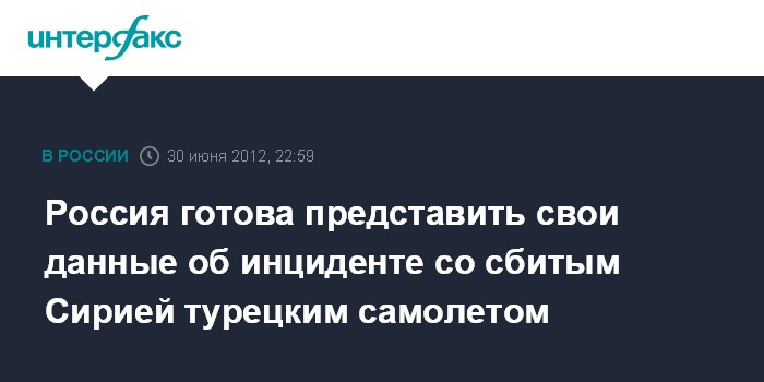 Женева. 30 июня. ИНТЕРФАКС - У России есть свои данные по поводу инцидента с турецким самолетом, сбитым Сирией, и Москва готова ими поделиться.