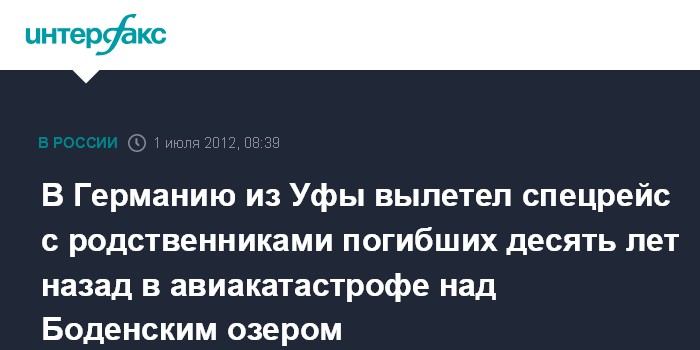 Уфа. 1 июля. ИНТЕРФАКС-ПОВОЛЖЬЕ - Чартерный рейс со 110 родственниками погибших в авиакатастрофе десять лет назад пассажиров вылетел в воскресенье в 8:20 мск из Уфы в Фридрихсхафен (Баден-Вюртемберг, Германия) для участия в поминальных траурных мероприятиях на месте ЧП, сообщили агентству "Интерфакс-Поволжье" в дирекции уфимского международного аэропорта.
