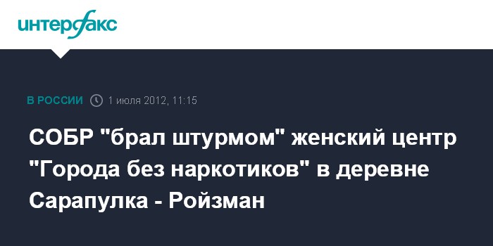 Екатеринбург. 1 июля. INTERFAX.RU - Сотрудники специального отдела быстрого реагирования (СОБР) пришли с проверкой в женский реабилитационный центр фонда "Город без наркотиков", находящийся в деревне Сарапулка под городом Березовский в Свердловской области, сообщил его президент Евгений Ройзман. "Сегодня центр женский брали штурмом. Человек 30 народу из СОБРа. Пытались двери вынести ломом, но у них не получилось. Им девочки (пациентки центра - ИФ) сами открыли", - сообщил Е.Ройзман агентству "Интерфакс-Урал" в воскресенье.