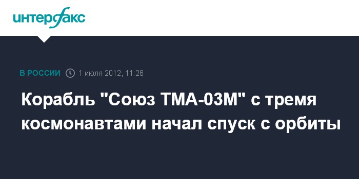 Королев (Московская область). 1 июля. INTERFAX.RU - Российский пилотируемый космический корабль "Союз ТМА-03М" включил двигатель для торможения и схода с околоземной орбиты. "Начался сход корабля с орбиты", - сообщили "Интерфаксу-АВН" в Центре управления полетами.