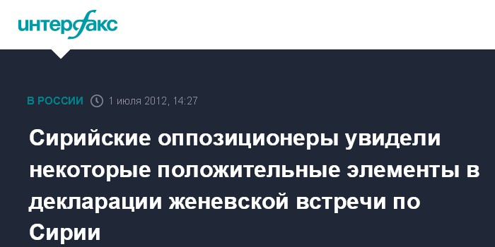 Стамбул. 1 июля. INTERFAX.RU - Заключительная декларация женевской встречи по Сирии содержит некоторые положительные элементы, однако план в целом неопределен и расплывчат, заявила в воскресенье АФП представитель Сирийского национального совета Басма Кодмани. "Первое - существует согласие относительно того, что семья Асада (президента Сирии - ИФ) более не может управлять страной, и не может руководить переходным периодом. Второе - существует согласие относительно того, что переходный период должен отвечать законным интересам сирийского народа, что для нас означает уход Асада, поскольку сирийцы уже выразились по этому поводу", - сообщила Б.Кодмани.
