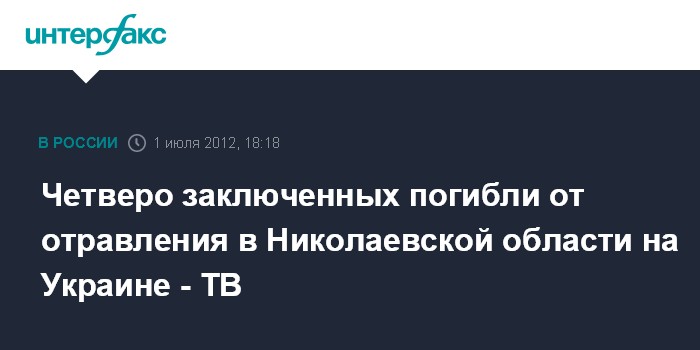 Киев. 1 июля. INTERFAX.RU - Четверо заключенных исправительно-трудовой колонии № 53 в поселке Ольшанское Николаевской области скончались в результате массового отравления, сообщает украинский "5 канал" со ссылкой на Николаевскую больницу скорой помощи.
