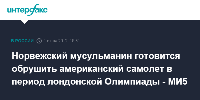 Норвежский мусульманин готовится обрушить американский самолет в период лондонской Олимпиады - МИ5