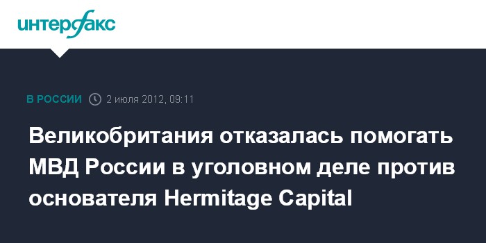 Москва. 2 июля. INTERFAX.RU - Великобритания отказала МВД РФ в оказании правовой помощи по уголовному делу о неуплате налогов руководством компании Hermitage Capital, сообщили "Интерфаксу" в понедельник в пресс-службе Следственного департамента (СД) МВД РФ.