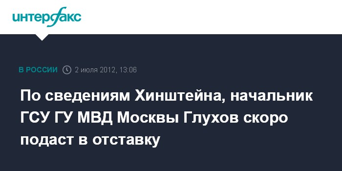 "Новый прогноз: в ближайшее время уйдет начальник ГСУ ГУ МВД Москвы Глухов: его уже вызвали в кадры МВД и предложили написать рапорт на увольнение", - сообщил Хинштейн в понедельник в "Твиттере".