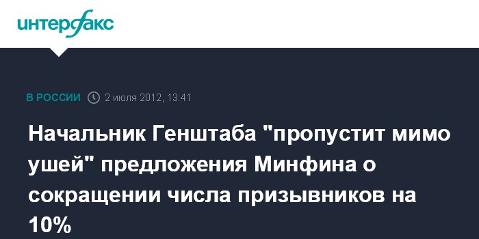 Ранее заместитель министра финансов РФ Татьяна Нестеренко предложила сбалансировать расходы федерального бюджета в том числе за счет сокращения численности военнослужащих срочной службы. "Предлагаю сократить численность призывников на 10%", - сказала Нестеренко.