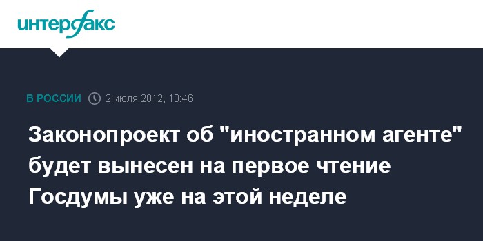 Москва. 2 июля. INTERFAX.RU - Поправки в закон о НКО, касающиеся статуса "иностранного агента", будут рассмотрены в первом чтении на заседании Госдумы в конце этой недели, сообщил журналистам в понедельник спикер Сергей Нарышкин.