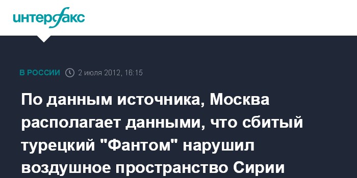 Москва. 2 июля. INTERFAX.RU - Россия располагает объективными данными о маршруте полета турецкого истребителя F-4 "Фантом", который был сбит силами противовоздушной обороны Сирии, сообщил "Интерфаксу-АВН" в понедельник военно-дипломатический источник в Москве.
