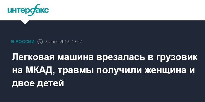 Москва. 2 июля. INTERFAX.RU - Двое детей и женщина пострадали в результате ДТП с участием легкового автомобиля и грузовика на МКАД, сообщил "Интерфаксу" источник в правоохранительных органах в понедельник.