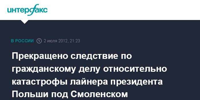 Варшава. 2 июля. INTERFAX.RU - Прокуратура Польши прекратила гражданское следствие по катастрофе президентского самолета под Смоленском в апреле 2010 года, сообщила в понедельник польская "Газета выборча".