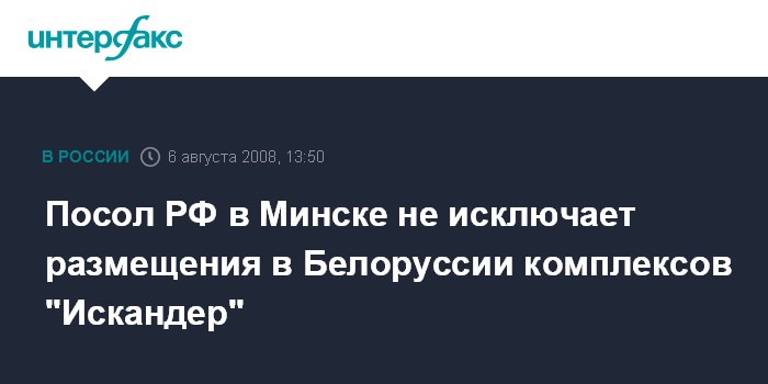 Минск. 6 августа. INTERFAX.RU - На территории Белоруссии возможно размещение ракетных комплексов "Искандер" либо стратегических бомбардировщиков в ответ на размещение элементов системы американской ПРО в Чехии и Польше, заявил посол России в Белоруссии Александр Суриков.