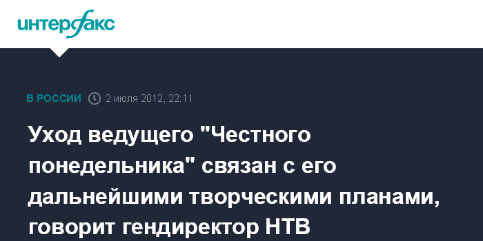 Уход ведущего "Честного понедельника" связан с его дальнейшими творческими планами, говорит гендиректор НТВ