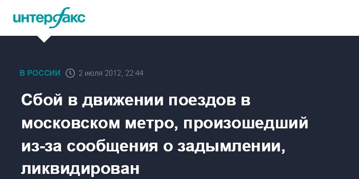 Москва. 2 июля. INTERFAX.RU - Сбой в движении поездов на Калужско-Рижской линии столичного метро произошел из-за сообщения о задымлении на перегоне между станциями Третьяковская и Китай-город.
