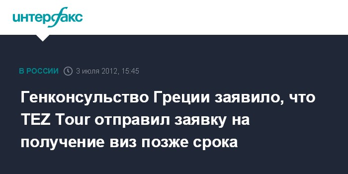 Москва. 3 июля. INTERFAX.RU - Заявка на получение виз в Грецию от туроператора TEZ Tour поступила в сервисно-визовый центр Греции значительно позже крайнего срока, установленного для срочных виз, говорится в сообщении генконсульства Греции во вторник.