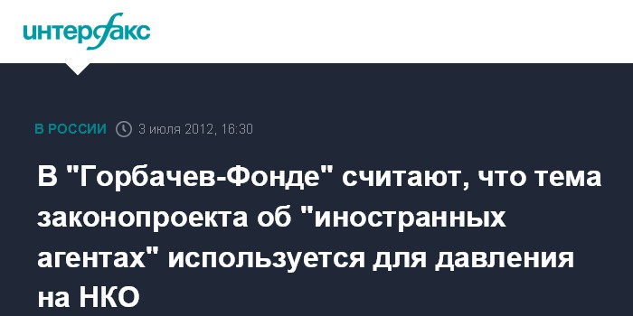 Москва. 3 июля. INTERFAX.RU - Абсурдными назвали в пресс-службе "Горбачев-Фонда" высказывания депутата-"единоросса" Роберта Шлегеля о том, что фонд войдет в число "иностранных агентов", согласно новому законопроекту об НКО.
