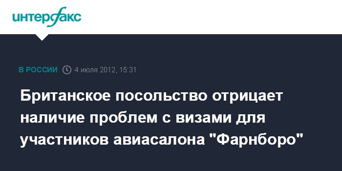 Москва. 4 июля. INTERFAX.RU - Посольство Великобритании в Москве заявило, что выдало визы всем российским представителям, собирающимся на авиавыставку в Фарнборо, которые обратились в дипмиссию в установленные сроки.