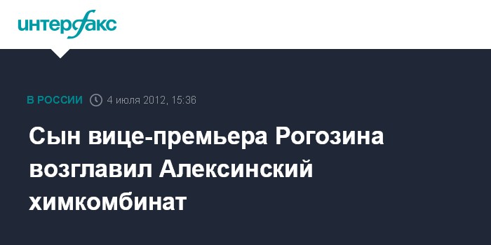 Тула. 4 июля. INTERFAX.RU - Алексей Рогозин, сын вице-премьера Дмитрия Рогозина, курирующего военно-промышленный комплекс России, назначен исполнительным директором федерального казенного предприятия "Алексинский химический комбинат" (ФКП "АХК") в Тульской области, сообщили "Интерфаксу" в областном правительстве.