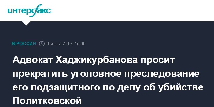 Москва. 4 июля. INTERFAX.RU - Защита предполагаемого организатора убийства обозревателя "Новой газеты" Анны Политковской - бывшего сотрудника МВД Сергея Хаджикурбанова требует от следствия прекратить его уголовное преследование.